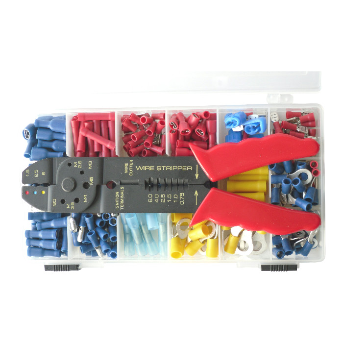 Komplet primeren za profesionalno ali domačo uporabo. Vsebuje 18 vrst, skupaj 280 kosov najpogosteje uporabnih konektorjev, končnikov in spojnikov v praktični in uporabni sortirni škatli iz trpežne plastike. Vsi elementi so z ne-gorljivo izolacijo: skrčljiva ali vinil PVC.