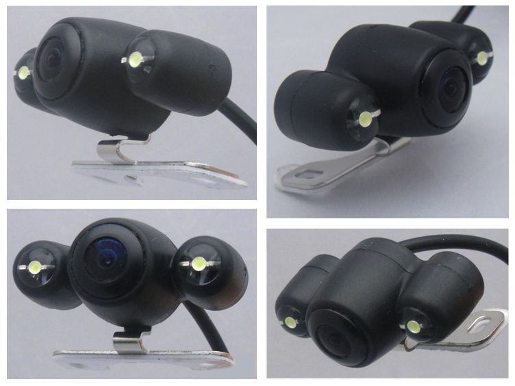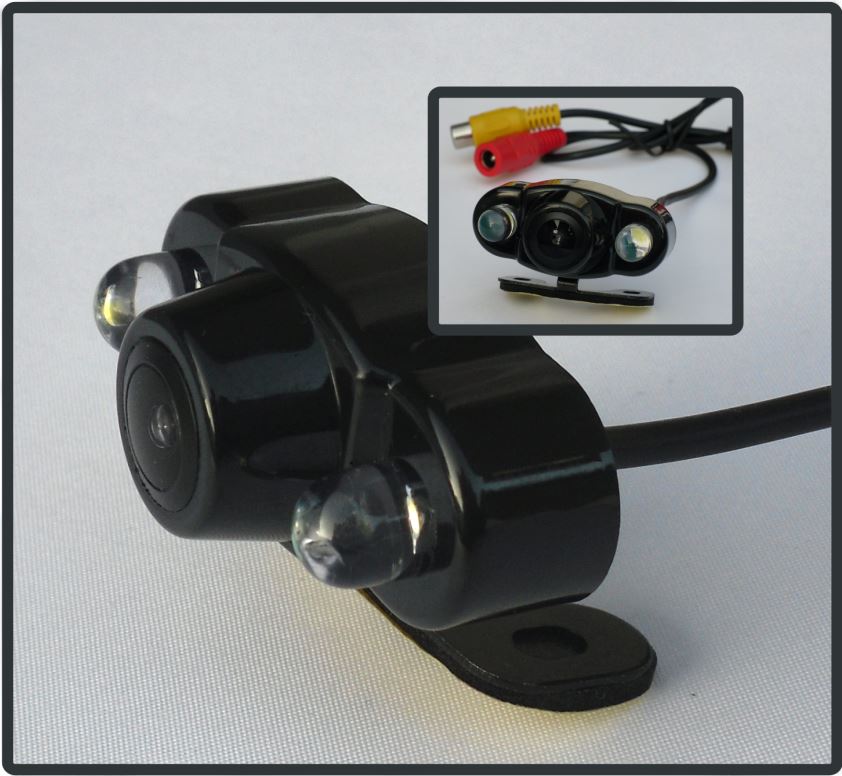 Vodoodporna avto kamera z LED CREE lučkami (2 x) – dodatno osvetli prostor, 120° 12 V DC, 648×488 točk, 6m video kabel RCA, z zbujevalcem (triger), mere 48 x 20 x 24 mm, na kovinskem nosilcu – s tem lahko enostavno prilagajate smer snemanja.