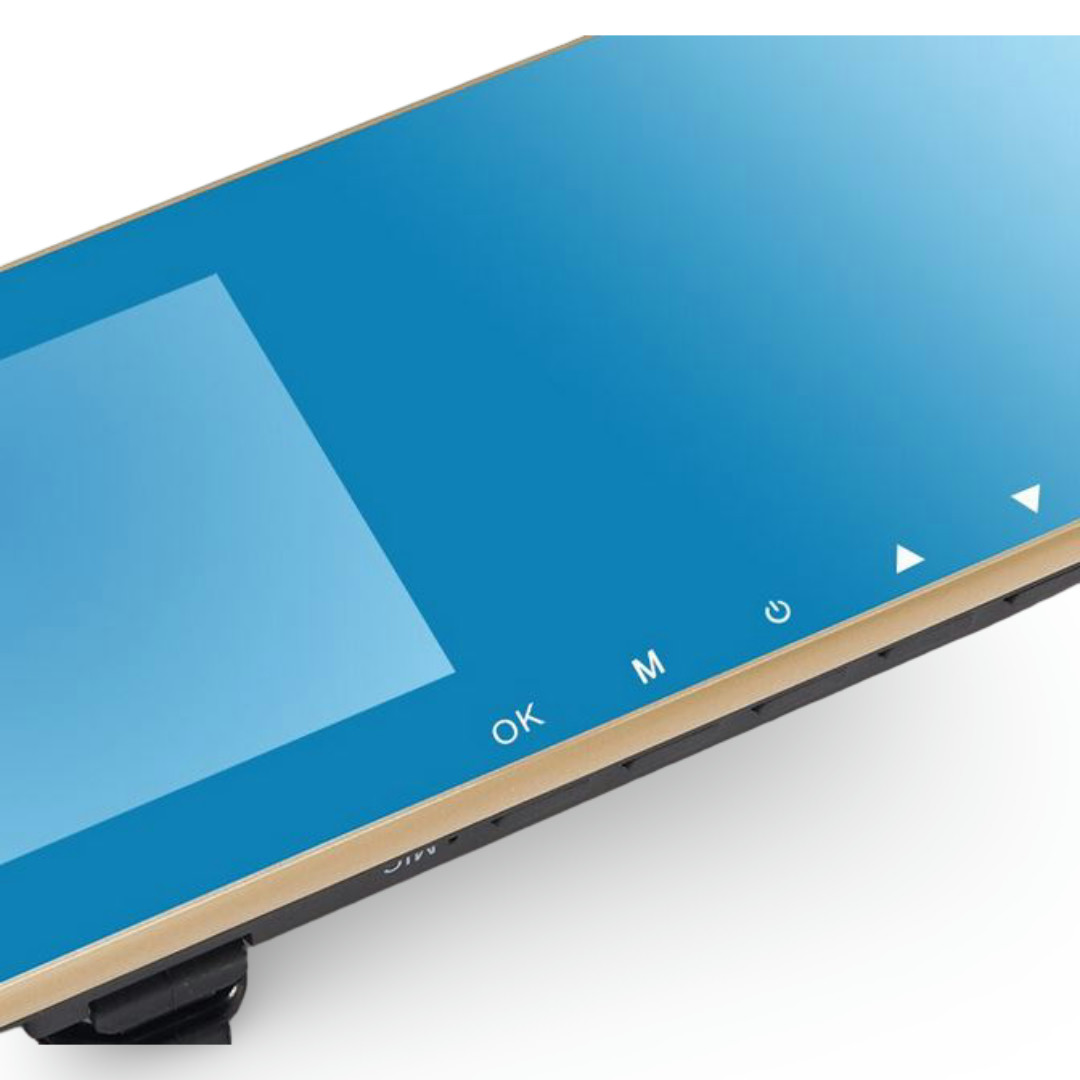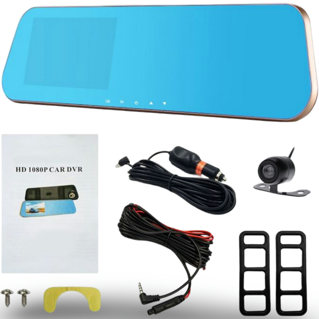 Monitor ogledalo + 2 avto kamera snemalnik (1 x Full HD), 4.3″ LCD zaslon, 140 stopinj, G-sensor, snemate na micro SD kartico (2-32 GB), krožno snemanje, 30 slik/s, AVI video zapis, do 1920×1080, polnilna baterija 420 mAh.