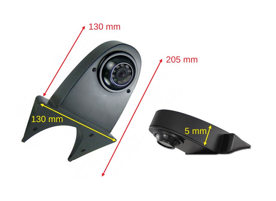 Vodoodporna avto kamera namenjena za tovorna, kombinirana vozila. Podaljšan vrat pripomore, da kamera ujame večji kot tik ob vozilu. Mere: 21 x13 x 6 cm, vrat 13 cm, – senzor Sharp CCD 120°, NTSC/PAL, IR 0,03 Lux vidljivost v temi približno 9 m, priložen