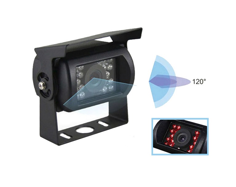 Robustna, vodoodporna in trpežna avto kamera z IR, 120°, 12-24V DC za vgradnjo na avtodom, avtobus, tovorna vozila, delovne stroje. Mere: 75 x 46 x 55 mm, brez varnostne črto za razdaljo, priložen video kabel 10 m + triger.