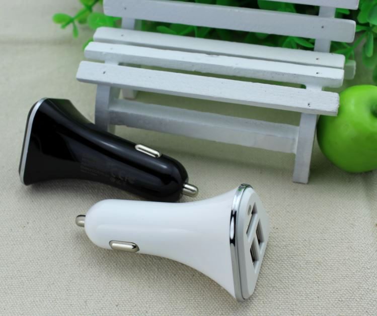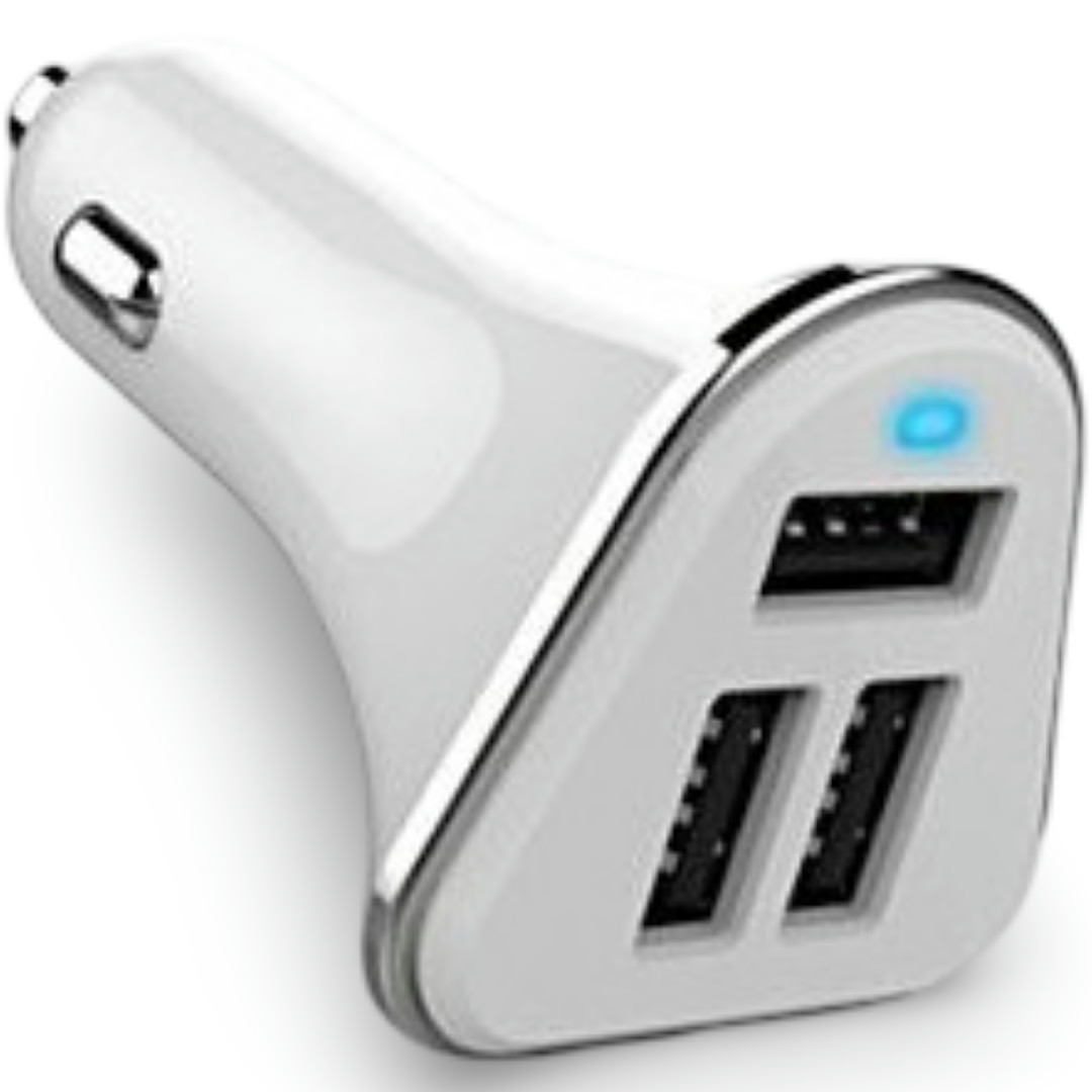 Bel močan avto polnilec z prenapetostno zaščito in zaščito proti segrevanju baterije, ABS obstojno in trpežno ohišje, modra LED osvetlitev. Polni lahko 3 naprave istočasno – vhodna napetost 12-24, izhod 5.2A/DC5 V, 3xUSB. Mere 75x40x40mm, teža 26,5g