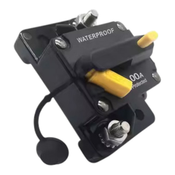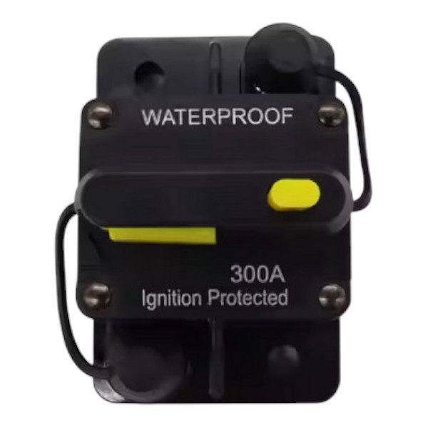 Avtomatska varovalka oz. vodoodporen avtomatski odklopnik črne barve do 300A za zaščito električnih tokokrogov v vozilih, plovilih in drugih sistemih z napetostjo 12-48V DC. Nudi zanesljivo zaščito pred preobremenitvami in kratkimi stiki. Vgrajeno je stikalo (v rumeni barvi) za ponastavitev oziroma ponovni vklop, kar omogoča hitro obnovo sistema po izpadu. Idealno za različne DC aplikacije, kjer je potrebna varnost in zaščita – avto industrija, navtika, delovni stroji in naprave.