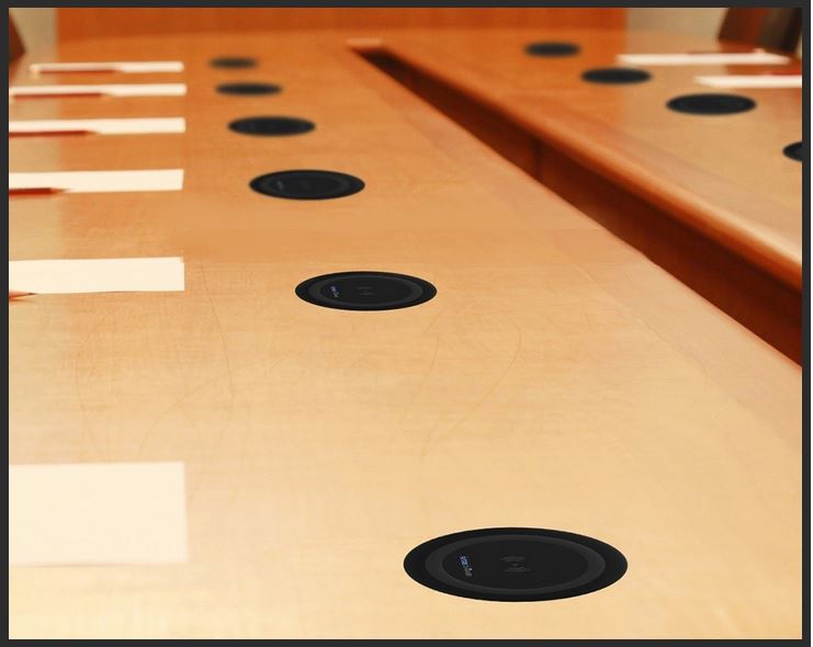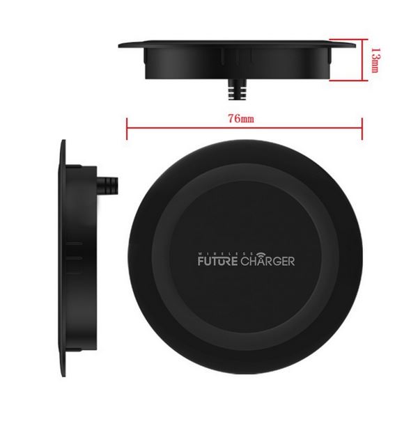 Brezžični indukcijski vgradni hitri polnilnik za telefone – podpira Qi standard, učinek polnjenja približno 72%, oddaljenost največ do 10 mm, vgradite ga v pisalno mizo ali pohištvo, vidna mera: 76 x 2 mm, vgradna mera: 60 x 10 mm, teža 59 g, USB kabel.