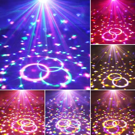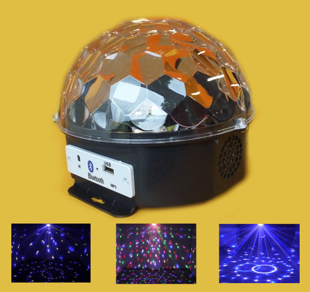 Svetleča glasbena krogla predvaja MP3 glasbo (USB) ali predvajate glasbo kar iz vašega telefona preko bluetooth povezave. Vgrajena sta dva zvočnika, priložen je daljinec. Deluje na 220V, se odziva na glasbo, v gibanju razni liki in barve, mere: 17 x 15 cm