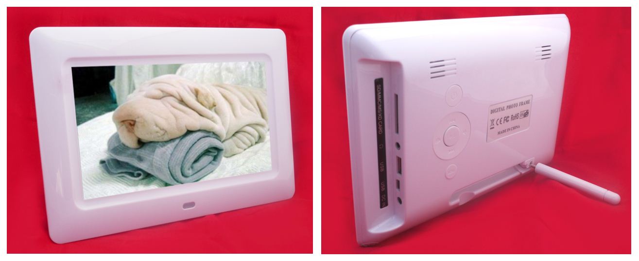 Ločljivost 800 x 480, USB, SD, predvaja zapise JPEG, MP3, DivX, AVI…, budilka, zvočniki