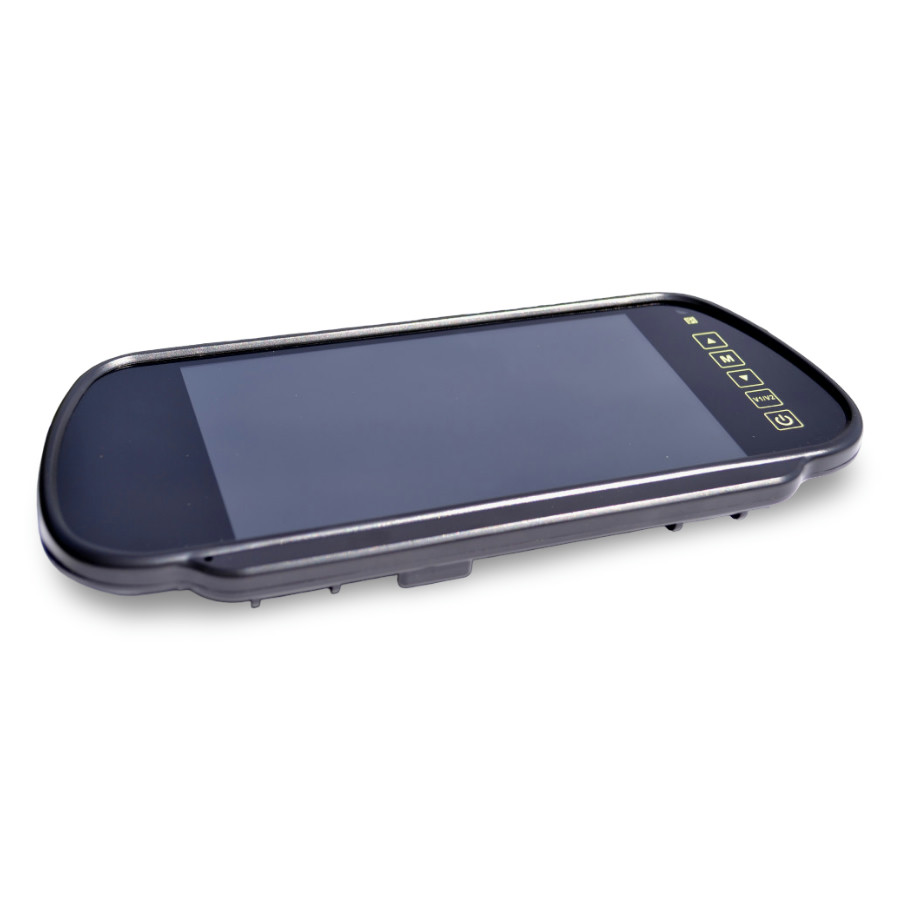 LCD monitor ogledalo 7” (17,78 cm), visoka ločljivost, AHD signal, 12 V DC, 2 x video vhod, enostavna namestitev na obstoječe ogledalo ali se privijači na nosilec, primerno za tovorna, kombinirana vozila, avtodom kjer vzvratno ogledalo ni aktivno.