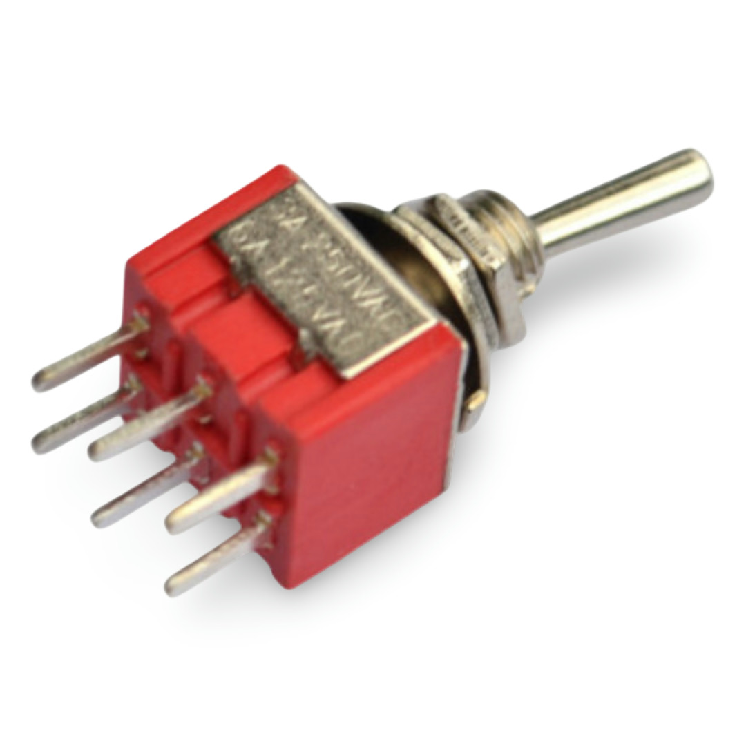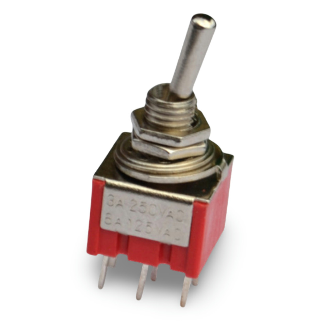Mini dvopolno klecno stikalo za napetost 250V-3A, 125V-6A AC, 6 x pin, mere za vgradnjo: premer navoja 5mm, ohišje 12 x 12 mm, funkcija: vklop/izklop/vklop