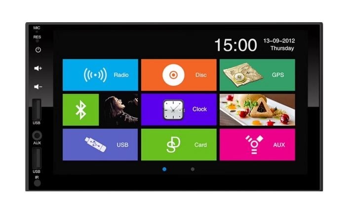 TFT zaslon na dotik, Full HD 1080P, vse osnovne potrebe multimedije v vozilu: Bluetooth, FM Radio (brez RDS in samodejnega iskanja kanala), video vhod za avto kamero, povezava telefona “mirror link” (žično), 2 x USB, 1 micro SD, mere 175 x 100 x 100 cm