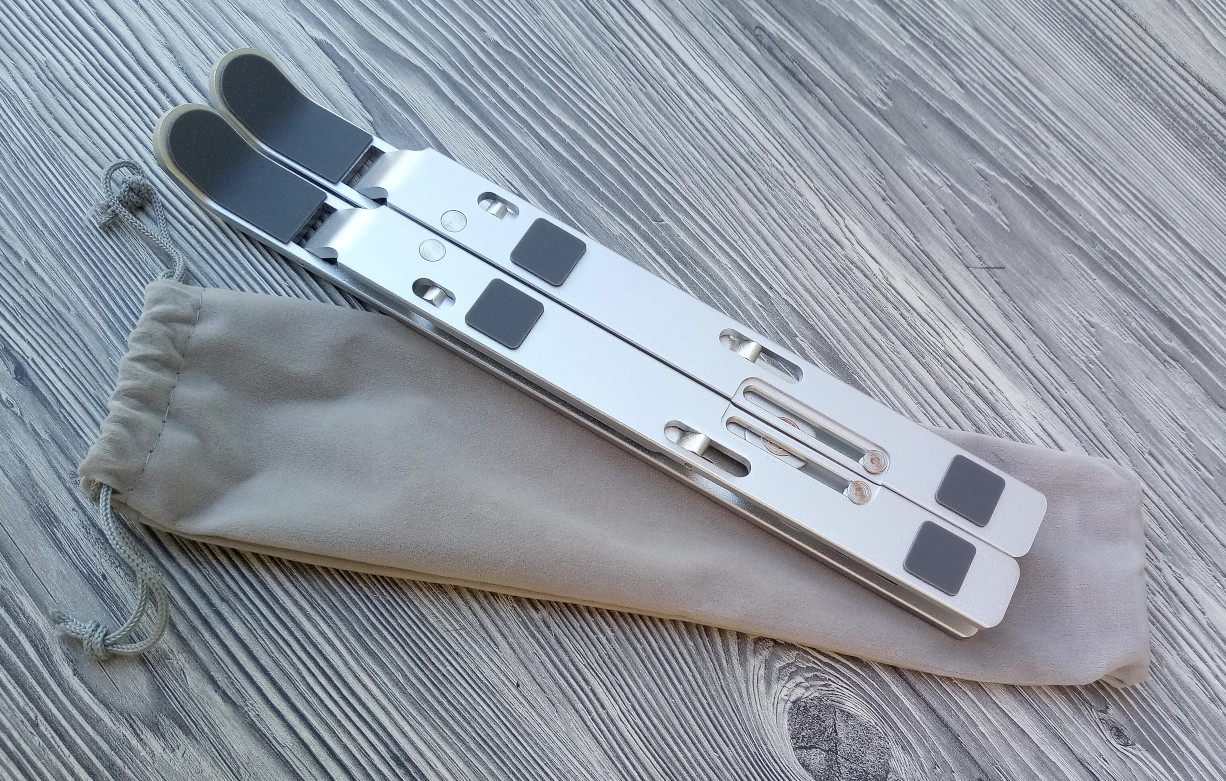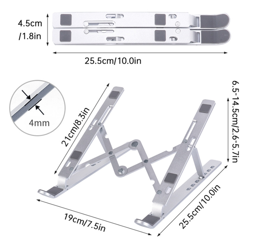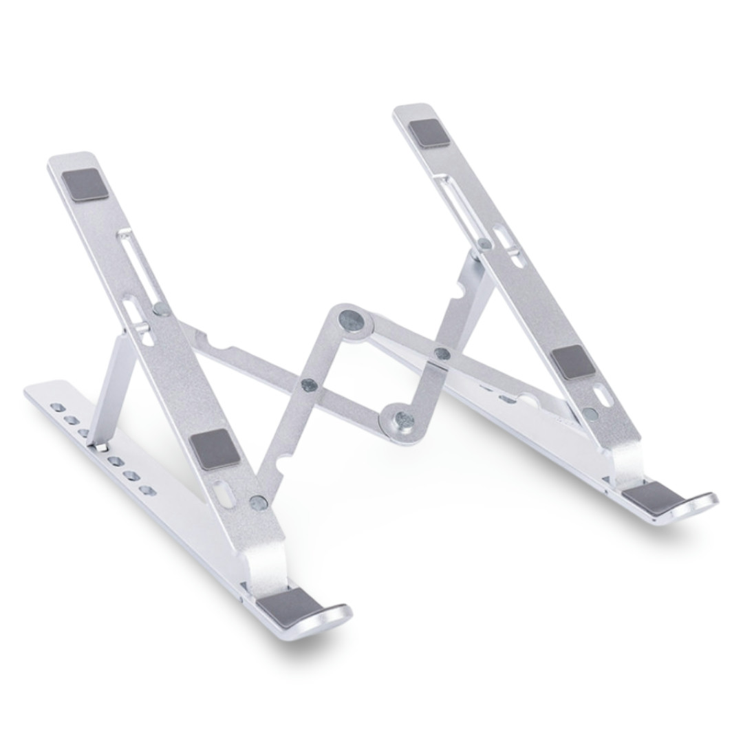 Zložljiv nosilec iz aluminija/silikon je prilagodljiv v višino in širino. Nastavite si lahko ustrezno lego prenosnika, tablice ali druge naprave. Mere: zložljiv 25.5×4.5×1.5 cm, raztegljiv 25.5×4.5-19 cm, naklon od 12-40 stopinj, teža 250g.
