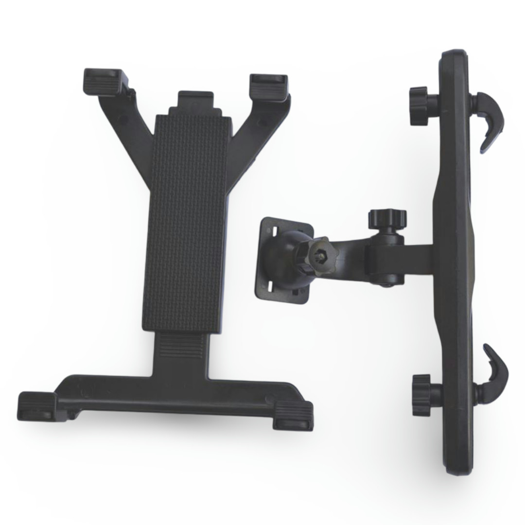 Gibljiv nosilec za pritrditev na vzglavnik avto sedeža za Tablice, IPAD, eBOOK… hitra in enostavna namestitev, pritrditev na nosilne palice od 55 mm do 205 mm, kraki raztegljivi od 150 mm do 255 mm, za naprave do debeline 38 mm