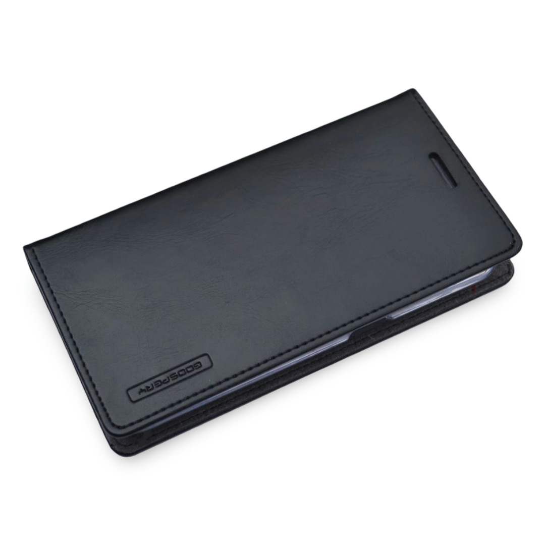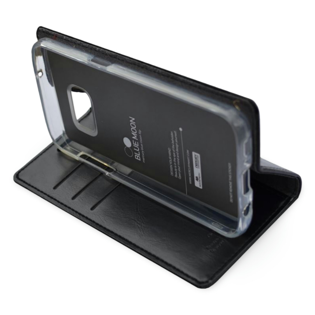 Črna, zaščitna preklopna torbica je natančno izdelana iz umetnega usnja, ščiti pred udarci in zunanjimi vplivi, mehko ogrodje se lepo in trdno prilagaja telefonu, pregib omogoča postavitev pod kotom, 3 odprtine za kartice, 1 večji žep.