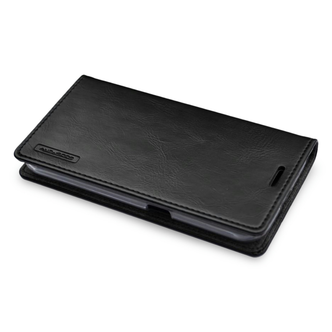 Črna, zaščitna preklopna torbica je natančno izdelana iz umetnega usnja, ščiti pred udarci in zunanjimi vplivi, mehko ogrodje se lepo in trdno prilagaja telefonu, pregib omogoča postavitev pod kotom, 3 odprtine za kartice, 1 večji žep.