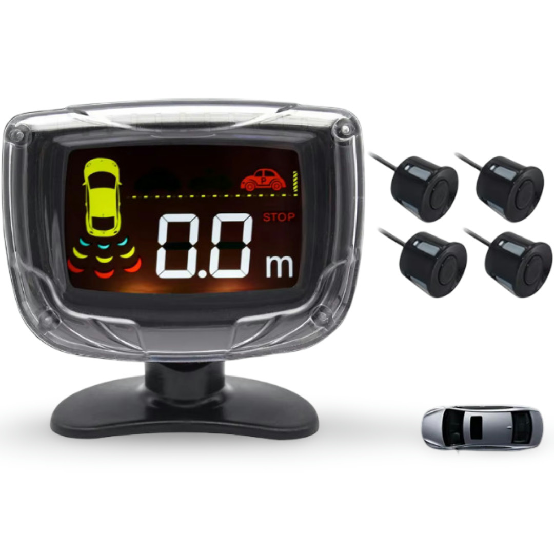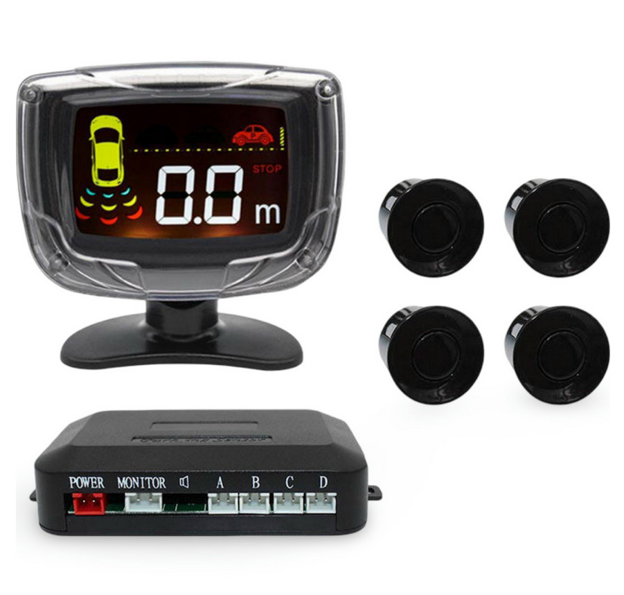 Set ima 4 parkirne senzorje (16,5mm), zaslon prikazuje smeri ovire in razdaljo (od 0,3m do 2m), opozorilni zvok ima štiri stopnje.