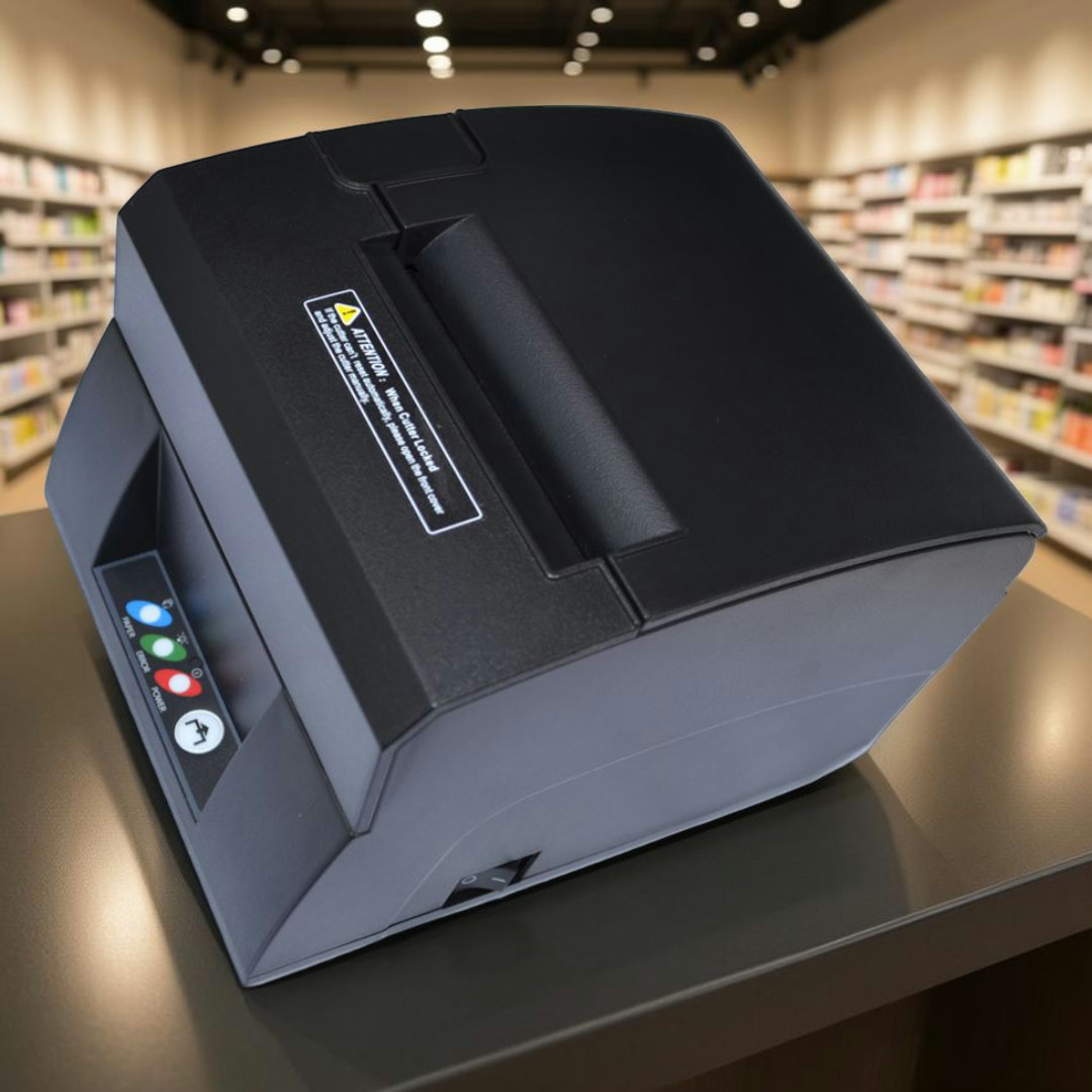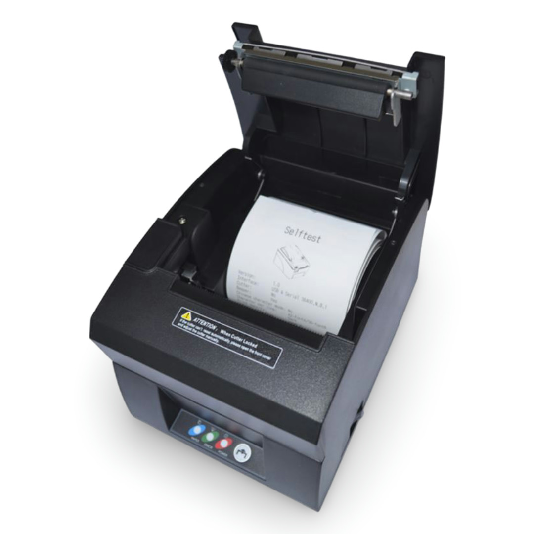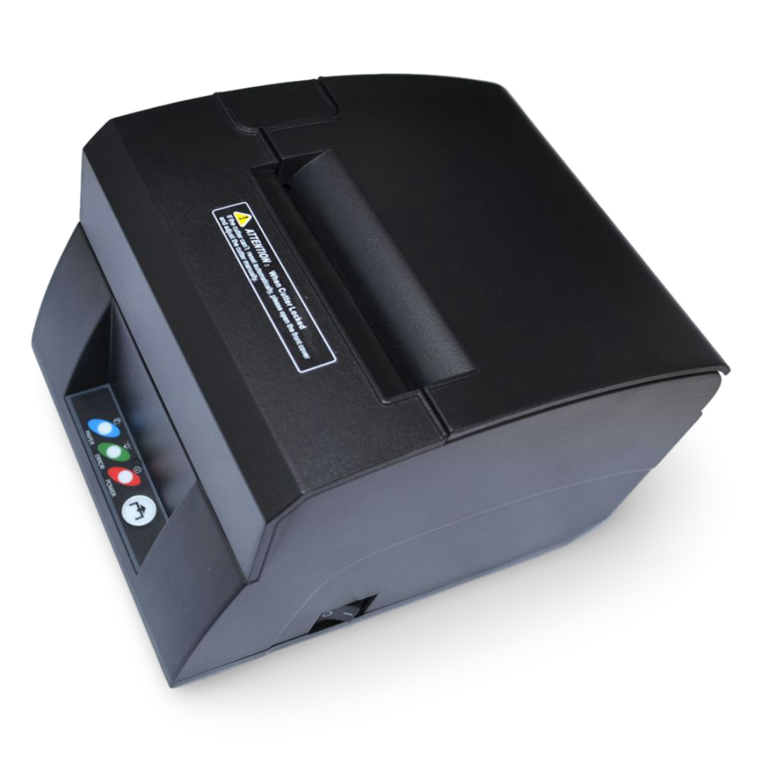 Termični tiskalnik za izdajanje računov do širine 80mm, USB priključek, podpira predal za denar RJ11, hitrost tiskanja 160 mm/s, tiskanje 576 DPI na vrsto, nastavljiv rezalnik papirja, mehanizem za 100km tiskanja, tipalo za papir