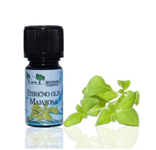 Pridobljeno s parno destilacijo rastline in cvetov majarona. Je rumene barve, ki postopoma prehaja v rjavo in ima močno zeliščen, nekoliko oster, sladek vonj s podtonom lesa in medicinskega vonja. Pomirja, a tudi ojača, ima antioksidanten učinek. Lahko deluje proti bolečinam, krčem, pomaga pri bolečih sklepih in mišicah ali menstrualnih težavah. Koristen je pri prehladih, saj lahko lajša izkašljevanje, sicer pa zmanjšuje stres in napetost, ojača koncentracijo. Uporabljal se je še pri pljučnih obolenjih, razjedah v ustih, glavobolu in migreni.