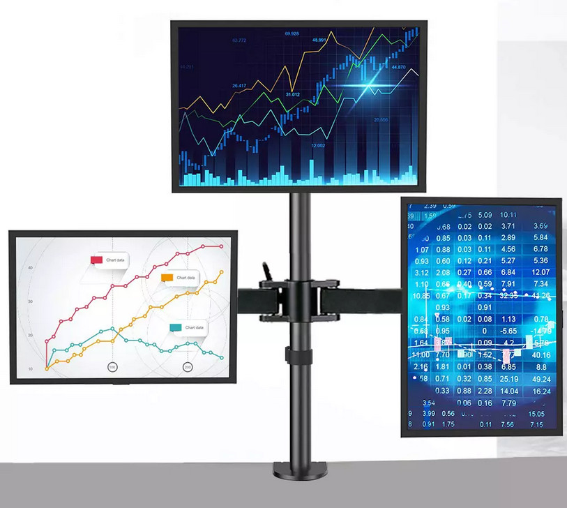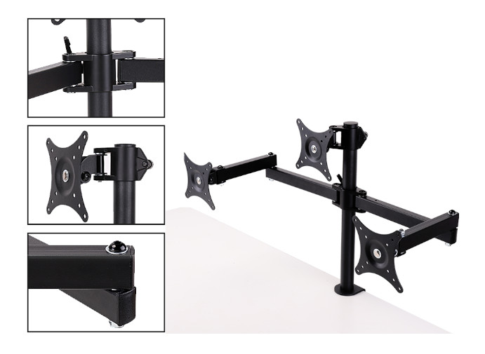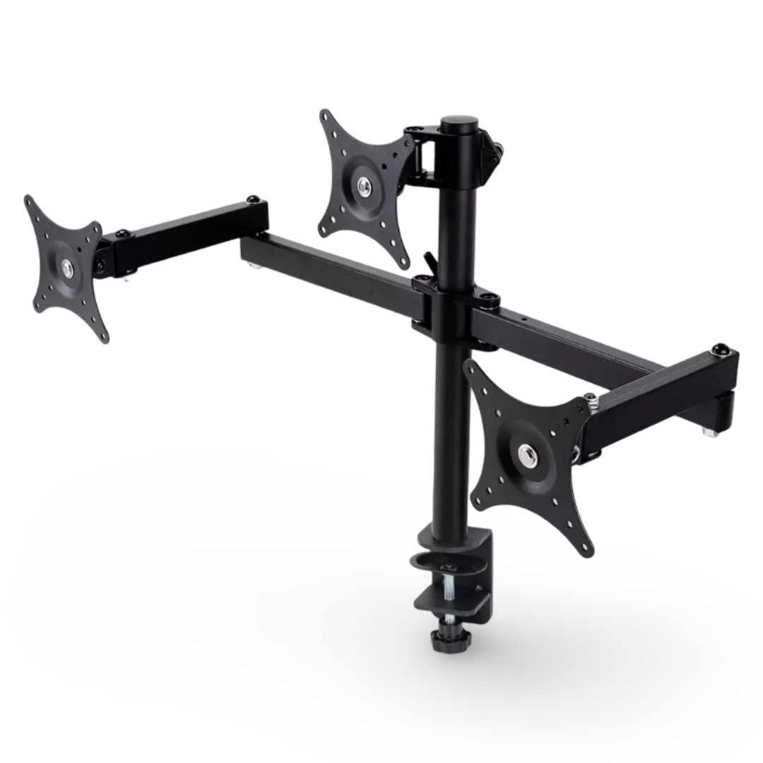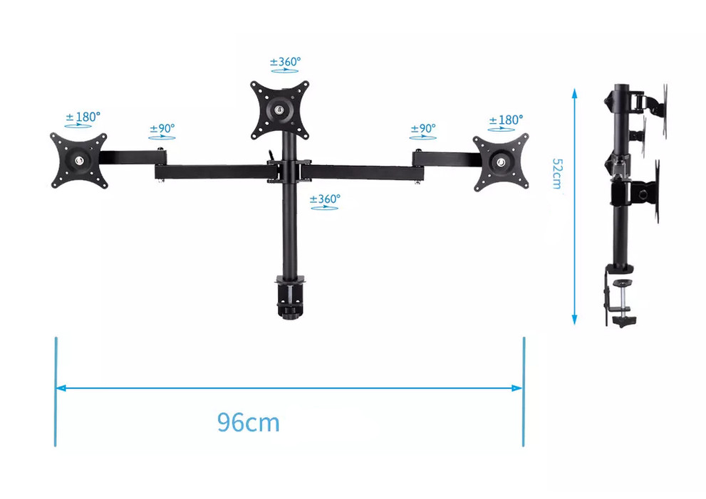 Namizni nosilec za tri monitorje velikosti od 10-32″, sprostite lahko veliko prostora na pisalni mizi. Nosilnost na monitor 5kg, pritrditev VESA standard (50*50, 75*75, 100*100), stojalo je gibljivo 20/90/180/360 stopinj, barva črna, teža izdelka 3,60 kg