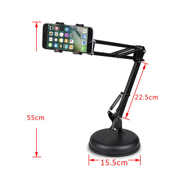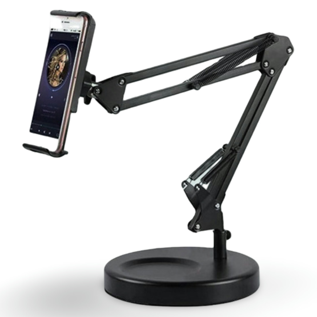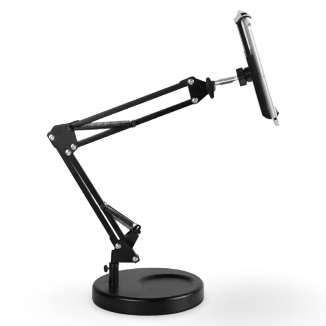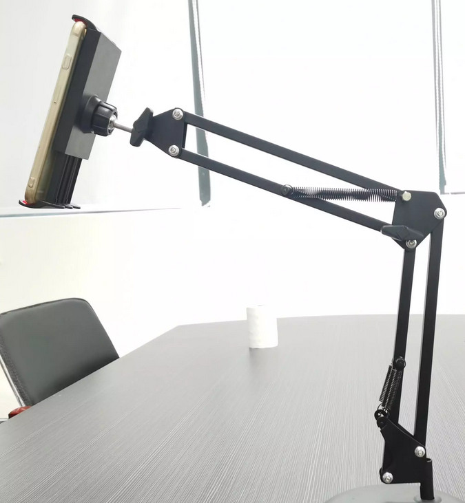 Kovinsko stojalo za telefon. Nosilec je vsestransko uporaben, gibljiv in praktičen. Položaj nosilca lahko pogosto spreminjate s potegom ali potiskom. Skupna dolžina 55 cm, teža 1.15 kg, barva črna.