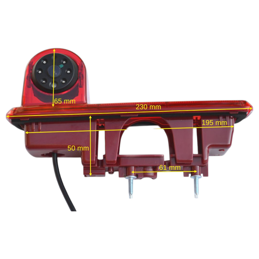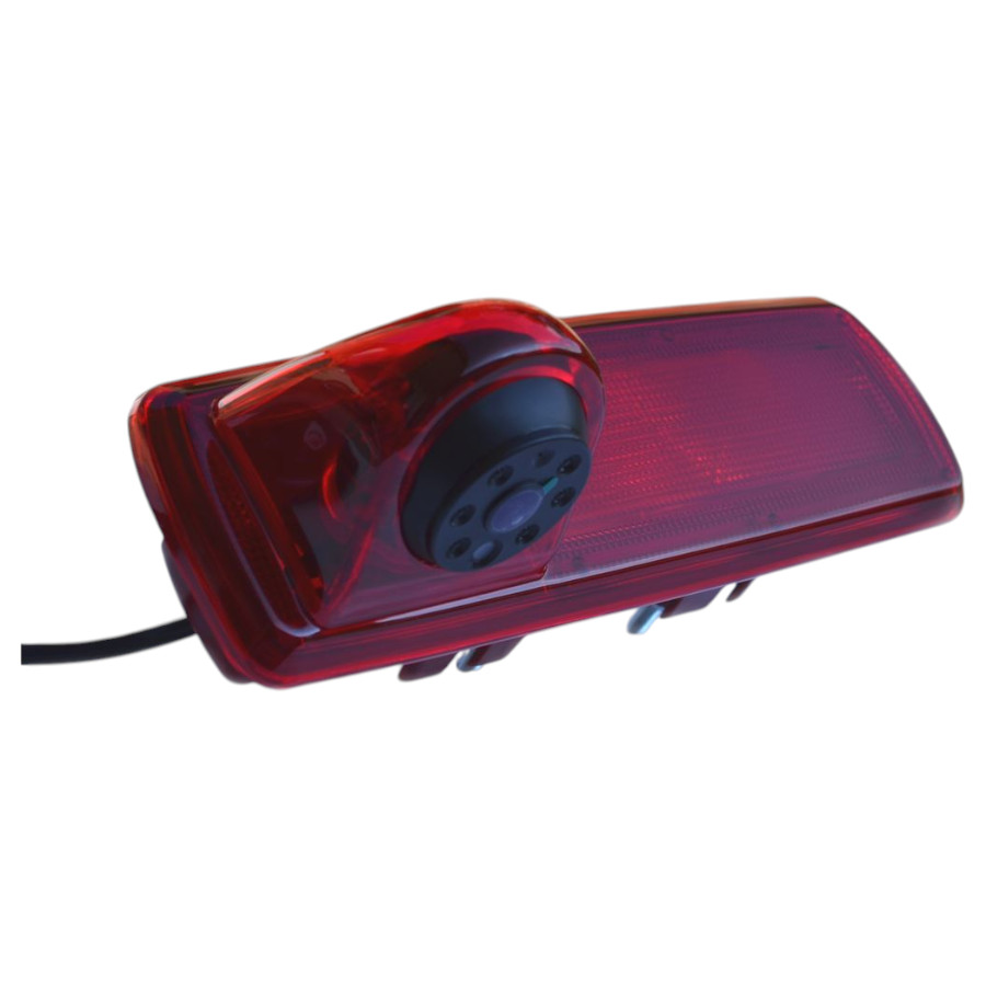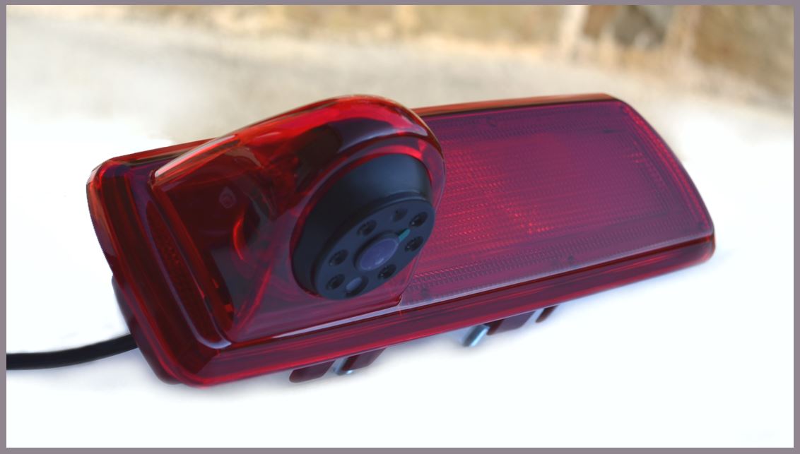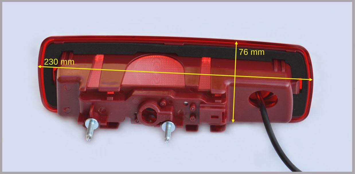 Vodoodporna avto kamera z zavorno lučko za Renault Trafic, Opel Vivaro 2014, mere: 23 x 7.6 x 6.5 cm – senzor CCD 768×494 PAL, 120°, IR 8x vidljivost v temi približno do 9 m, priložen video kabel 10 m 4PIN + RCA adapter