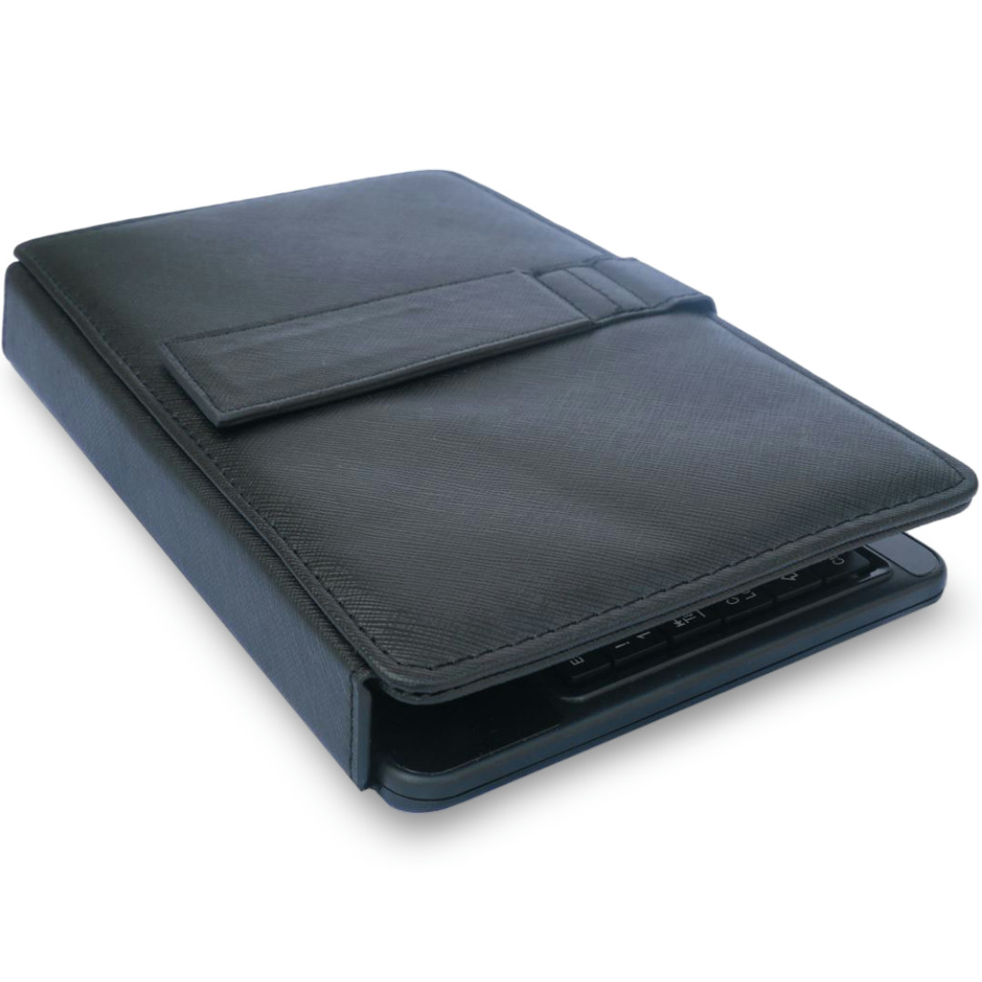 Črna priročna zaščitna torbica za približno 10″ tablice + tipkovnica. Priključek tipkovnice je USB. Mere nosilcev: največ 28 x 18 cm in najmanj 20 x 16 cm. Zgornji nosilec se prilagaja, zapiranje z magneti, možnost naslona.